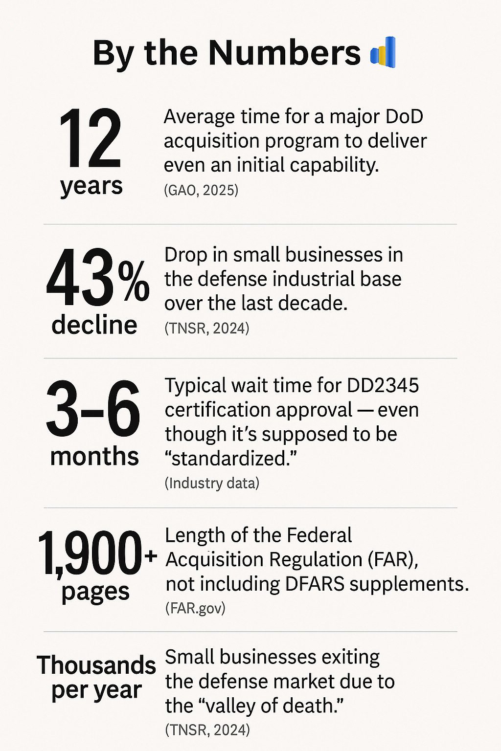 And this isn’t just a small business complaint — it’s a national security issue. The threats we face don’t wait for portal resets or legal clarifications. Adversaries aren’t slowed down by redundant clauses; they’re iterating while we’re uploading forms. Complexity doesn’t just slow the system. It makes us less competitive on the world stage.