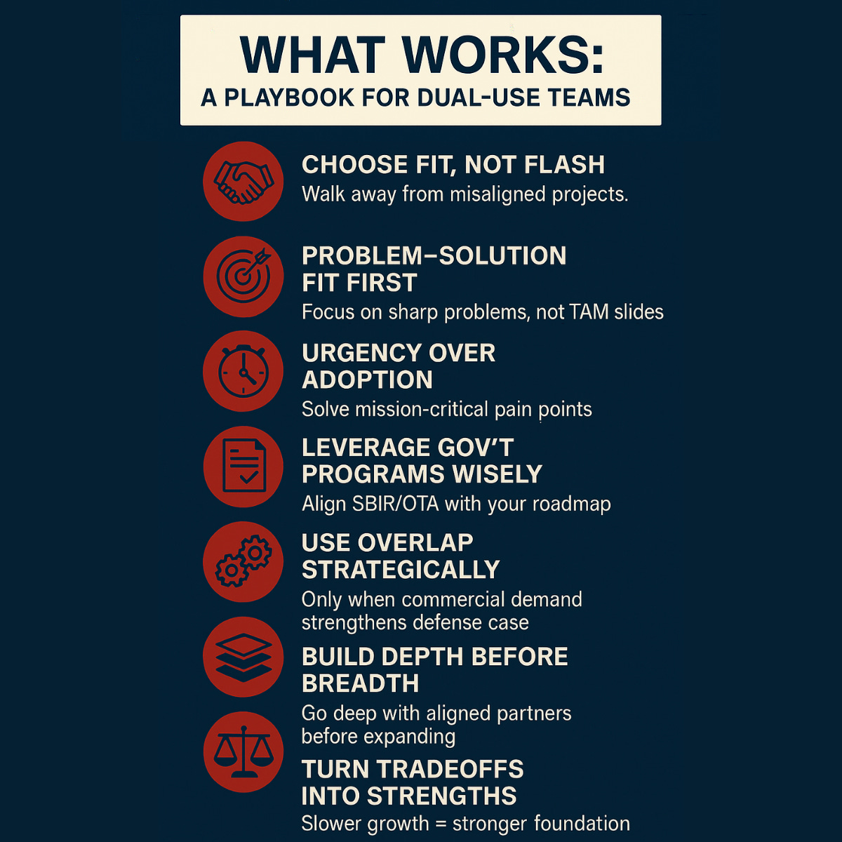 For dual-use builders, the playbook looks different. It’s slower on the surface, but deeper in impact.